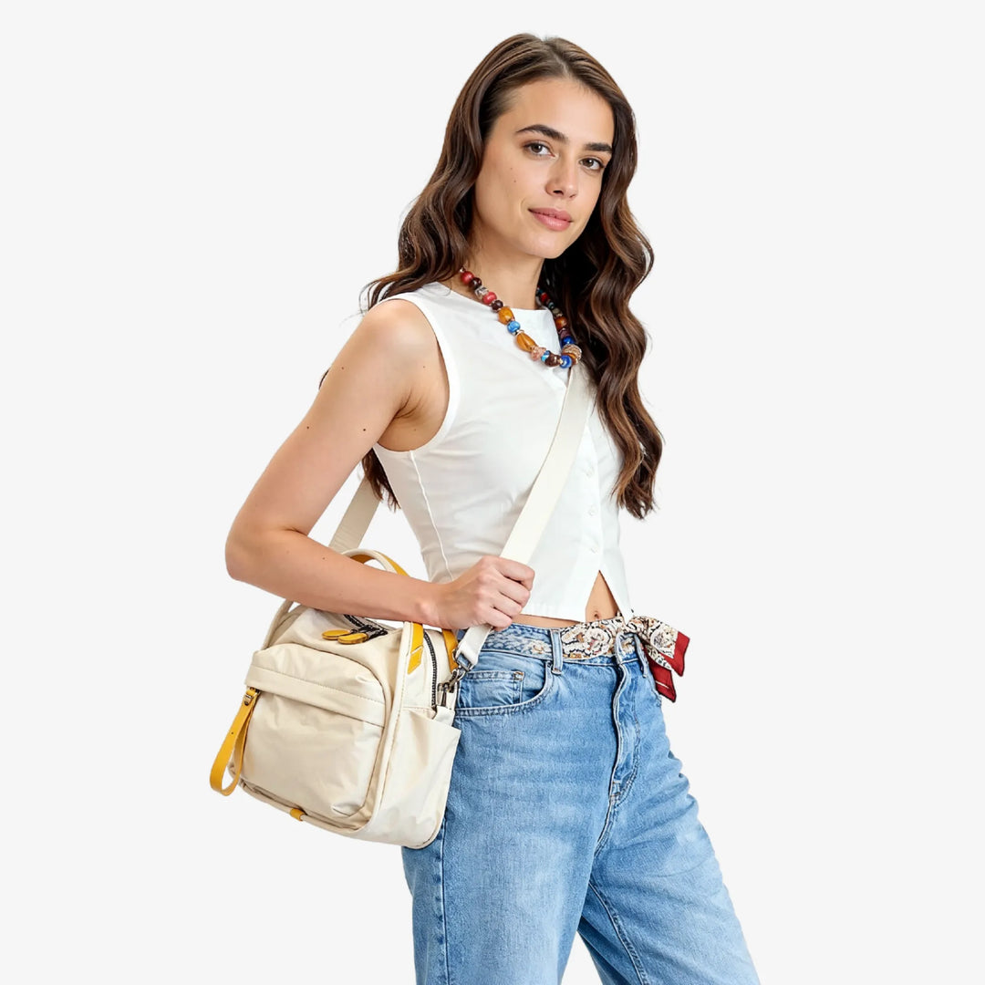 The Lyona features a spacious main compartment, a secure back pocket for valuables, and a quick-access front pocket for essentials.
